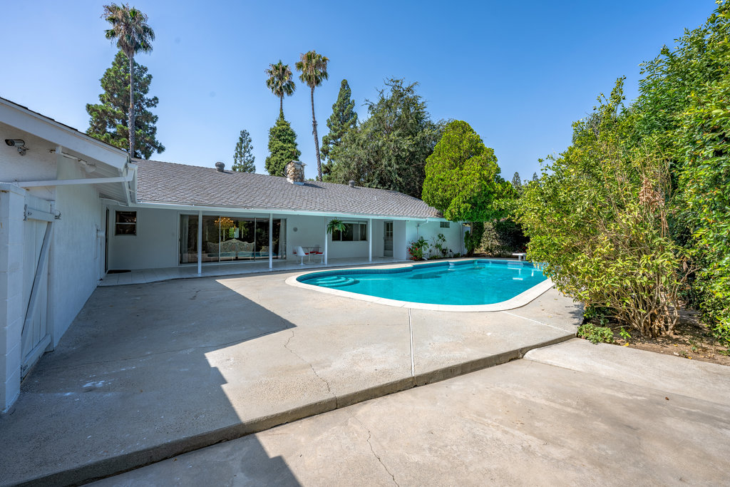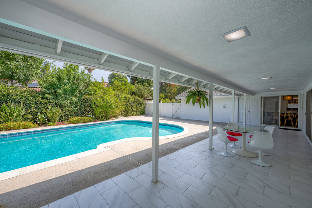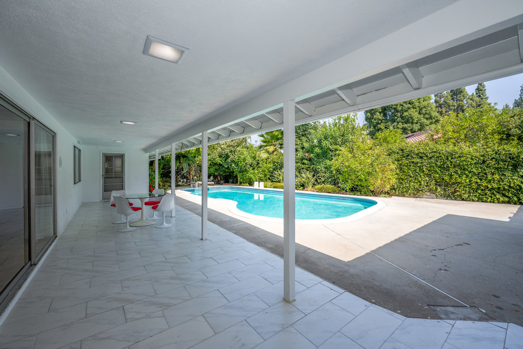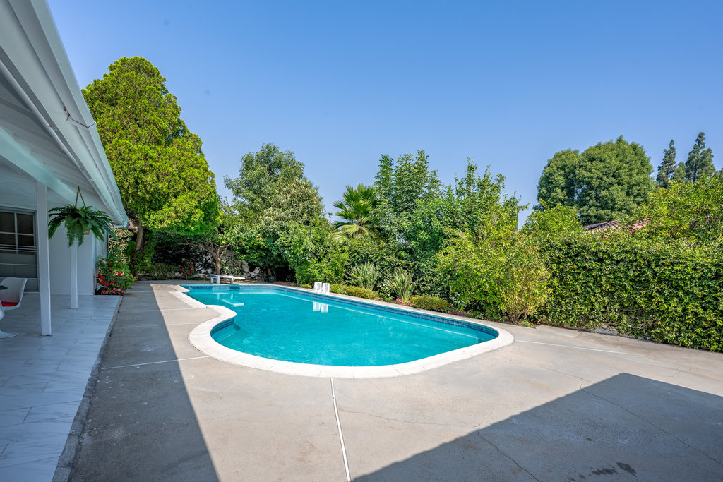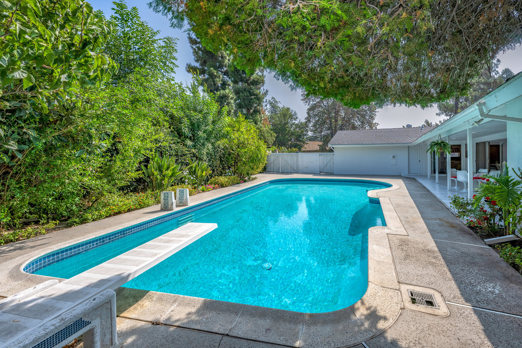 Welcome to your dream home – a stunning Mid-Century Modern masterpiece that effortlessly blends timeless charm with contemporary comforts. Nestled on an expansive 11,646 sq ft corner lot, this 4-bedroom, 3.5-bath gem offers 2,729 sq ft of meticulously maintained living space, designed for both relaxation and entertainment. Step inside to reveal elegant Parquet flooring that flows seamlessly through the inviting living room and the cozy step-down family room. The home’s original character shines through large windows and sliding doors, bathing the interior in natural light and offering views of the lush outdoors. The spacious primary suite is a true sanctuary, complete with an en suite bathroom, abundant closet space, and direct access to the backyard and sparkling pool—a private oasis just steps away. The additional three bedrooms are generously sized, featuring built-in storage and ample closet space. A Jack-and-Jill en suite bathroom connects two of the bedrooms, while a pristine hallway bathroom adds both convenience and style. The heart of the home is the expansive kitchen, boasting a charming built-in breakfast nook overlooking the pool—a perfect spot to start your day. Entertain with ease in the large living room, complemented by a sophisticated wet bar. A dedicated laundry room, adjacent half bath, and extra storage space add to the home’s functionality. Outdoor living is a dream with a private patio off the dining area, ideal for alfresco dining or peaceful coffee breaks. The backyard showcases a glistening pool and a covered patio that spans the length of the home, creating an entertainer’s paradise. With ample parking in front of the garage and additional space for larger vehicles, convenience is key. Located in a highly sought-after, tranquil neighborhood, this property is just moments from Northridge Mall, home to Portos, Yard House, AMC Theaters, Starbucks, Dave & Busters, Macy’s, Gold’s Gym, and more. Experience the perfect fusion of serene living and vibrant city amenities in this exceptional Mid-Century Modern residence.